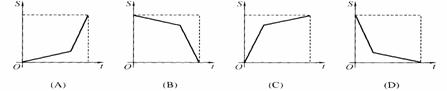 18、某学生从家里去学校,开始时匀速跑步前进,跑累了后,再匀速步行余下的路程。下图所示中,横轴表示该生从家里出发后的时间t,纵轴表示离学校的路程S,则路程S与时间t之间的函数关系的图象大致是 ( )