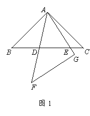 ,若∆ABC固定不动,∆AFG绕点A旋转,AF、AG与边BC的交点分别为D、E(点D不与点B重合,点E不与点C重合),设BE=m,CD=n