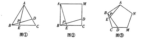 25.(本题10分)如图①、②、③中,点E、D分别是正△ABC、正四边形ABCM、正五边形ABCMN中以C点为顶点的相邻两边上的点,且BE=CD,DB交AE于P点.