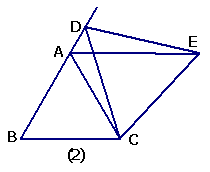 3)如图(2),将(1)中点D运动到边BA的延长线上,所作仍为等边三角形。请问是否仍有AE∥BC?证明你的猜想。
