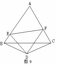 24.(10分)如图9,△ABC是边长为1的等边三角形,BD=CD,∠BDC=120°,E、F分别在AB、AC上,且∠EDF=60°,求△AEF的周长.