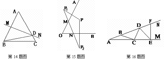 15.如图,若P为∠AOB内一点,分别作出P点关于OA、OB的对称点P1P2,连接P1P2交OA于M,交OB于N,P1P2=15,则△PMN的周长是________.