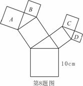 8、如图,所有的四边形都是正方形,所有的三角形都是直角三角形,其中最大的正方形的边长为10cm,正方形A的边长为6cm、B的边长为5cm、C的边长为5cm,则正方形D的面积为( )