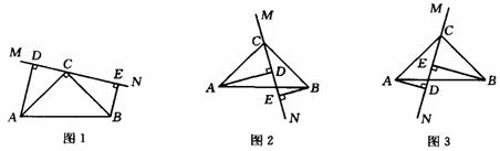 ⑶当直线MN绕点C旋转到图⑶的位置时,试问DE、AD、BE具有怎样的等量关系?请写出这个等量关系,并加以证明.