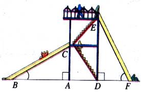 2.如图,有两个长度相同的滑梯,左边滑梯的高度AC与右边滑梯水平方向的长度DF相等,两个滑梯的倾斜角∠ABC和∠DFE的大小有什么关系