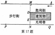17.(10分)如图,一段街道的两边缘所在的直线分别为AB、PQ,并且AB∥PQ,建筑物的一端DE所在的直线MN⊥AB于点M,交PQ于点N,小亮从胜利街的A处,沿着AB方向前进,小明一直站在点P的位置等候小亮.