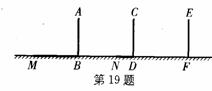 19.(10分)电线杆上有一盏路灯O,电线杆与三个等高的标杆整齐划一地排列在马路的一侧,AB、CD、EF是三个标杆,相邻两个标杆之间的距离都是2m,已知AB、CD在灯光下的影长分别为BM=1.6 m、DN=0.6 m(如图).