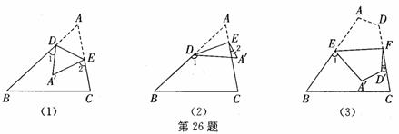 26.(10分)如图(1),把△ABC纸片沿DE折叠,使点A落在四边形BCED内部点A′的位置,通过计算我们知道2∠A=∠1+∠2.请你继续探索: