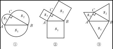 (2) 如图,分别以直角三角形ABC三边为边向外作三个半圆,其面积分别用S1、S2、S3表示,请你确定S1、S2、S3之间的关系并加以证明。