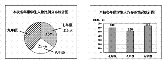 24.为了帮助四川灾区学生重返课堂,某市团委发起了“爱心储蓄”活动,鼓励学生将自己的压岁钱和零花钱存入银行,定期一年,到期后可取回本金,而把利息捐给灾区学生. 某校所有同学全都积极参加了这一活动,为灾区同学献一份爱心. 该校学生会根据本校这次活动绘制了如下统计图.