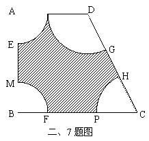 如图,四边形ABCD是一个直角梯形,∠A=∠B=90°,AB=10cm,BC=12cm,AD=7cm,四个顶点处扇形的半径分别为AE=BF=3cm,DG=CH=4cm,则图中阴影部分的面积为___________cm2.(答案用含π的结果表示)