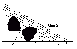 (2)以点A为圆心,以AB为半径作圆弧,当太阳光线与圆弧相切时树影最长,点D为切点,DE⊥AD交AC于E点,(如图) ………7分