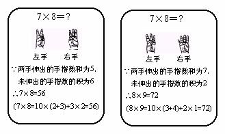 10、法国的“小九九”从“一一得一” 到“五五二十五”和我国的“小九九”是一样的,后面的就改用手势了。右面两个图框是用法国“小九九”计算78和89的两个示例。若用法国“小九九”计算79,左右手依次伸出手指的个数是( )