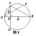 如图8,⊙O是△ABC的外接圆,AB为直径,AC=CF,CD⊥AB于D,且交⊙O于G,AF交CD于E.