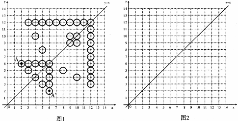 (1)请你在图2中,也用10枚以上的棋子摆出一个以直线y=x为对称轴的轴对称图案,并在所作的图形中找出两组对称点,分别标为B-B¢,C-C¢(注意棋子要摆在格点上)。