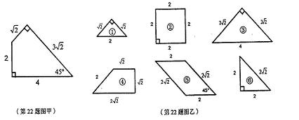 22、(本题10分)小明家用瓷砖装修卫生间,还有一块墙角面未完工(如图甲所示),他想在现有的六块瓷砖余料中(如图乙所示)挑选2块或3块余料进行铺设,请你帮小明设计两种不同的铺设方案(在下面图丙、图丁中画出铺设示意图,并标出所选用每块余料的编号)。