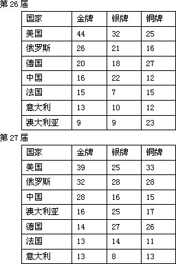 10、下表给出了在第26届、第27届国际奥林匹克运动会上,获得金牌前七名的国家的奖牌情况.