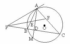 2、如图,PA为⊙O的切线,A为切点,PBC为割线,∠APC平分线PF交AC于点F,交AB于点E。(1)求证:AE=AF;(2)若PB∶PA=1∶2,M是弧BC上的一点,AM交BC于D,且PD=PC,试确定M点在弧BC上的位置,并证明你的结论。