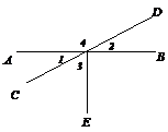 4、如图,直线AB、CD交于O点,∠1:∠2=1:3,∠AOC=600,则∠2=_______。