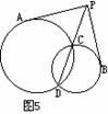 如图5,两圆相交于C、D,P为DC延长线上一点,PA、PB为两圆的切线,A、B为切点,若PA=6,则PB=_________,若PC:CD=1:2,则CD=_________。