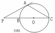 10、(2000辽宁)如图(15),PA为⊙O的切线,A为切点,割线PBC过圆心O,∠APC=300,OC=1cm,则PA的长为( )