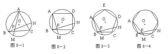 20、如图,8-1、8-2、8-3、…、8-n分别是⊙O的内接正三角形ABC,正四边形ABCD、正五边形ABCDE、…、正n边形ABCD…,点M、N分别从点B、C开始以相同的速度在⊙O上逆时针运动。
