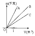 7. A、B、C三种物质的质量m(千克)与体积V(米3)的关系如图所示,那么这三种物质的密度