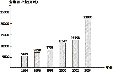23、(9分)宁波港是一个多功能、综合性的现代大港,年货物吞吐量居中国第二,世界第五,成功跻身国际大港行列,如图是宁波港1994年-2004年货物吞吐量统计图。