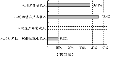 根据对全国31个省(区、市)68000个农户的抽样调查,一季度,农民人均现金收入(包括工资性收入、出售农产品收入、生产经营收入和财产性、转移性现金收入)比上年同期有明显增长. 其中三项现金收入人均增长数额占一季度人均现金收入增长数额的百分数如图所示,而出售农产品收入增加最多,达44元.