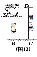 某居民小区有一朝向为正南方向的居民楼(如图12),该居民楼的一楼是高6米的小区超市,超市以上是居民住房.在该楼的前面15米处要盖一栋高20米的新楼.当冬季正午的阳光与水平线的夹角为32°时.