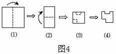 9、将一正方形纸片按图4中⑴、⑵的方式依次对折后,再沿⑶中的虚线裁剪,最后将⑷