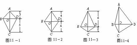 ⑵如图11-4,对于线段AC与线段BD垂直相交(垂足O不与点A,C,B,D重合)的任意情形,请你就四边形ABCD面积的大小提出猜想,并证明你的猜想;