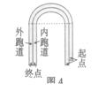 9.在一次学校运动会上,如图4是赛跑跑道的一部分,它由两条直道和中间半圆形弯道组成,若内、外两条跑道的终点在一直线上,则外跑道的起点必须前移,才能使两跑道有相同的长度.如果跑道宽为1.22米,则外跑道的起点应前进(π取3.14) ( ).
