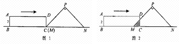 7.(河南课改 14分)如图1,Rt△PMN中,∠P=90°,PM=PN,MN=8cm,矩形ABCD的长和宽分别为8cm和2cm,C点和M点重合,BC和MN在一条直线上。令Rt△PMN不动,矩形ABCD沿MN所在直线向右以每秒1cm的速度移动(如图2),直到C点与N点重合为止。设移动x秒后,矩形ABCD与△PMN重叠部分的面积为y