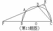 12.如图,四边形ABCD内接于以BC为直径的半圆O,且AB=AD,DA、CB的延长线相交于点P,CE⊥PE,PB=BO.已知DC=18,求DE的长.