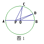 如图1,已知⊙O的半径是R,C、D是直径AB同侧圆周上的两点,弧AC的度数为960,弧BD的度数为360,动点P在AB上,则PC+PD的最小值为………………………( )