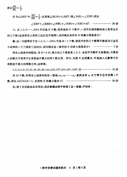 15.从1,2,3,······2004中任选K个数,使所选的K个数中,一定可以找到能构成三角形边长的三个数(这里要求三角形三边长互不相等),试问满足条件的K的最小值是多少?