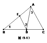 例题(10)、如图(1-1),在ΔABC中,D、E分别是BC、AB上的点,且∠1=∠2=∠3 ,如果ΔABC、ΔEBD、ΔADC的周长依次为m,m1,m2,求证: