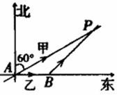 如图,甲、乙两辆货车于某日下午2:00同时从A地出发驶往P市,甲车沿一条公路向北偏东60°方向行驶,直达P市,其速度为30公里/小时;乙车先沿一条公路向正东方向行驶半小时后到达B地,卸下部分货物,再沿一条通向东北方向的公路驶往P市,其速度始终为40公里/小时.