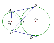 4、如图,⊙O1与⊙O2外切于T,AB为公切线,BT的延长线交⊙O1于点C,CD切⊙O2于点D。