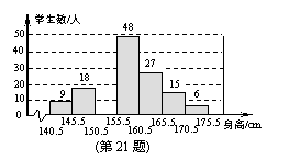 21、(本题8分)要了解某地区八年级学生的身高情况,从中随机抽取150名学生的身高作为一个样本,身高均在141cm-175cm之间(取整数厘米),整理后分成7组,绘制出频数分布直方图(不完整).根据图中提供的信息,解答下列问题: