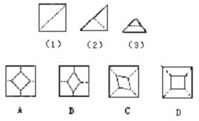 小强拿了一张正方形的纸如图(1),沿虚线对折一次得图(2),再对折一次得图(3),然后用剪刀沿图(3)中的虚线(虚线与底边平行)剪去一个角,再打开后的形状应是( )