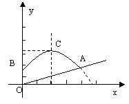 某农场为防治风沙,在一山坡上种植一片树苗,并安装了自动喷灌设备,一瞬间喷水头喷出的水流呈抛物线,如图所示,建立直角坐标系,已知喷水头B高出地面1.5米,喷水管与山坡所成的夹角∠BOA约为63º,水流最高点C的坐标为(2,3.5)