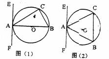 22、(本题10分)已知△ABC内接于⊙O,过点A作直线EF,(1)如图1,若AB为直径,要使得EF是⊙O的切线,还需要添加的条件是(只须写出两种不同情况)①_____________或②__________。