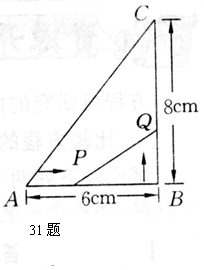 如图所示,△ABC中,∠B=90°,点P从点A开始沿AB边向B以1cm/s的速度移动,点Q从B 点开始沿BC边向C以2cm/s的速度移动。(1)如果P,Q分别从A,B同时出发,经几秒,使△PBQ的面积等于8cm2?(2)如果P,Q分别从A,B同时出发,并且P到B后又继续在BC边上前进,Q到C后又继续在CA边上前进,经过几秒,使△PCQ的面积等于12.6 cm2?(提示: P在BC边上,Q在AC边上。)(8分)