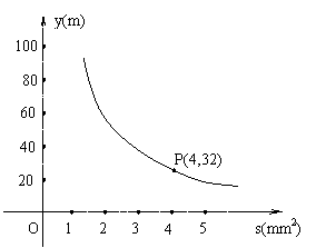 (本题满分7分)你吃过拉面吗?实际上在做拉面的过程中就渗透着数学知识:一定体积的面团做成拉面,面条的总长度y(m)是面条的粗细(横截面积) s (mm2)的反比例函数,其图像如图所示。