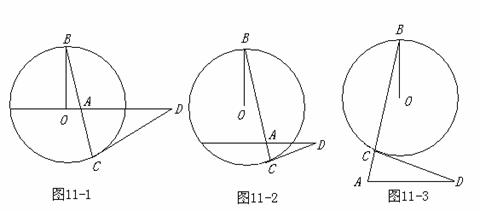 (2)将直线DA向下平移到半径OB外,如图11-2,那么DA与DC之间存在什么关系?(此小题只须说明结论,不必证明)