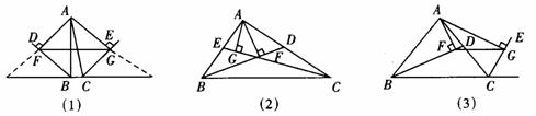 5.如图(1)所示,BD, CE分别是△ABC的外角平分线,过点A作AF⊥BD, AG⊥CE,垂足分别为;F,G,连结FG,延长AF, AG,与直线BC相交,易证FG=1/2(AB+BC+AC)