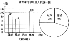 20.某中学进行体育教学改革,同时开设篮球、排球、足球、体操课,学生可根据自己的爱好任选其一.体育老师根据九年级学生的报名情况进行了统计,并绘制了下面尚未完整的频数分布直方图和扇形统计图.请根据统计图解答下列问题: