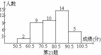 21.(本小题10分)初三某班对最近一次数学测验成绩(得分取整数)进行统计分析,将所有成绩由低到高分成五组,并绘制成如下图所示的频数分布直方图,请结合直方图提供的信息,回答下列问题: